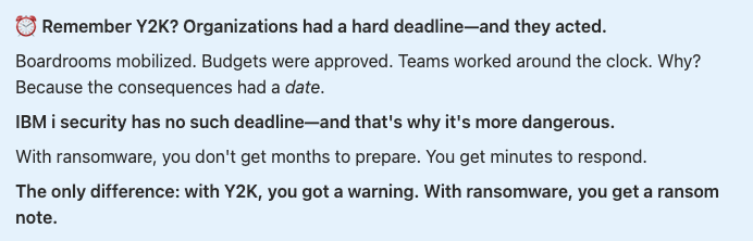The threat is accelerating. Over 50 CVEs have been published for IBM i since January 2024 alone, and IBM is warning that their platform is under active threat.